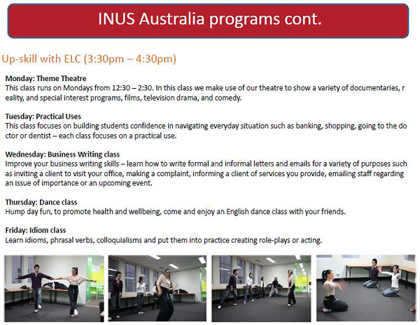 ´Ù¾çÇÑ ½ºÅ³ ¾÷ ÇÁ·Î±×·¥ - Dance - Business writing:formal&formal&informal À̸ÞÀÏ ÀÛ¼º ¿ä·É À̷¼ ¹× Àâ ÀÎÅÍºä ¿ä·É µî - Pratical uses : ÀÏ»ó»ýȰ¿¡¼ Ç×»ó Á¢ÇÏ°Ô µÇ´Â »óȲº° ¿ë¾î ¹× ´ëó ´É·Â Çâ»ó ¸ñÀû - Idiom class : ¿µ¾î±¸»ç½Ã °¡Àå Áß¿äÇϰí ÇʼöÀûÀÎ ¼÷¾î ¹× °ü¿ë±¸ Çâ»óÀ» ÅëÇÑ ¿øÇÒÇÑ ´ëÇÏ °¡´É ¸ñÀû