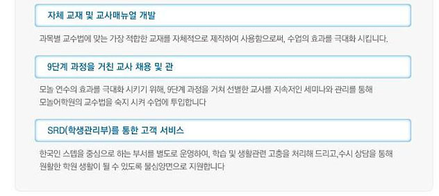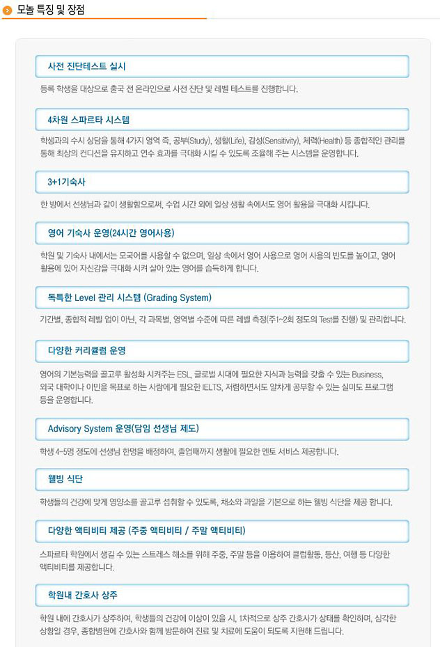 - ESLÀº ±âÃÊ¿¡¼ °í±Þ±îÁö ÀÏ¹Ý ¿µ¾î °úÁ¤À» ¸»Çϸç, È¸È Áß½ÉÀûÀ¸·Î ¼ö¾÷ÀÌ ÀÌ·ç¾î Áý´Ï´Ù. - °ú¸ñº° Å×½ºÆ®¸¦ Åä´ë·Î ¸Å 4ÁÖ(ÇÑÅÒ)¸¶´Ù Level °áÁ¤ ÈÄ ¼ºÀûÇ¥ ¹ß±ÞÇÏ°í ±× ³»¿ëÀ» Åä´ë·Î »ó´ã ÁøÇà - ÅÒ Á¾·á ½Ã ¼ºÀûÇ¥¸¦ ¹ß±ÞÇÏ°í ±× ³»¿ëÀ» Åä´ë·Î »ó´ã(°ú¸ñº°·Î ºÎÁ·ÇÑ ºÎºÐ check ÇÏ¿©, ´ÙÀ½ ·¹º§¿¡ Àû¿ë) - ¸ð³î ¾îÇпø³» ±³Àç ÆíÂùºÎ °³¼³(±³Àç ¿¬±¸ ¹× Á¦ÀÛ) - ¸ð³î ±³¼ö¹ý¿¡ ¸Â´Â ÀÚü Á¦ÀÛ ±³Àç »ç¿ë(DBC, WP, ECD, P&P, PD, WU µî) - 1:1 ¼ö¾÷ Ãß°¡ °¡´É(¿¬¼ö ½ÃÀÛ 4ÁÖ(ÇÑ ÅÒ Á¾·á) ÈÄ À¯·á·Î ½Åû °¡´É)